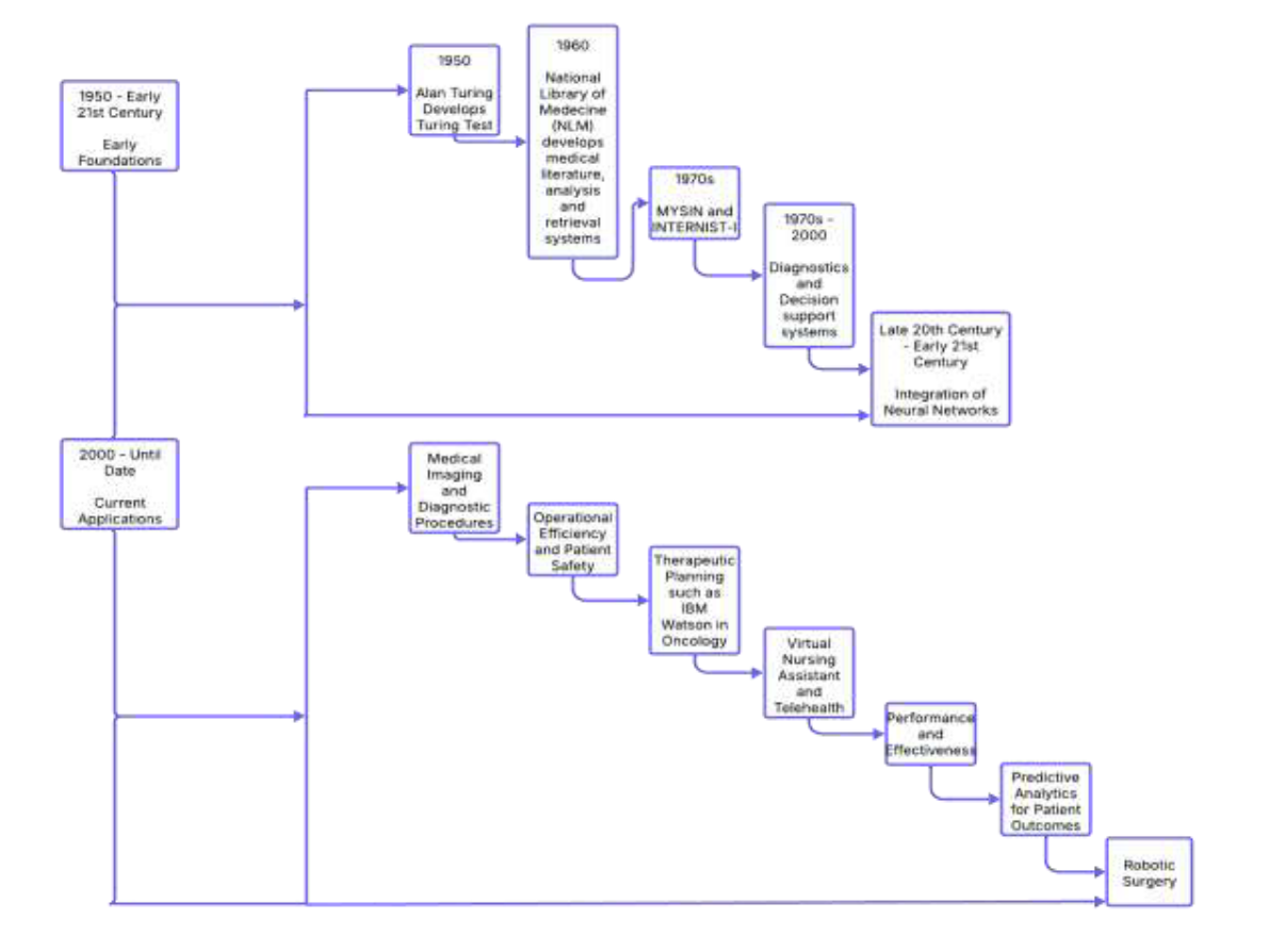 We synthesized findings from academic journals, regulatory reports, industry publications, and historical sources to establish a clear timeline of AI development in healthcare.